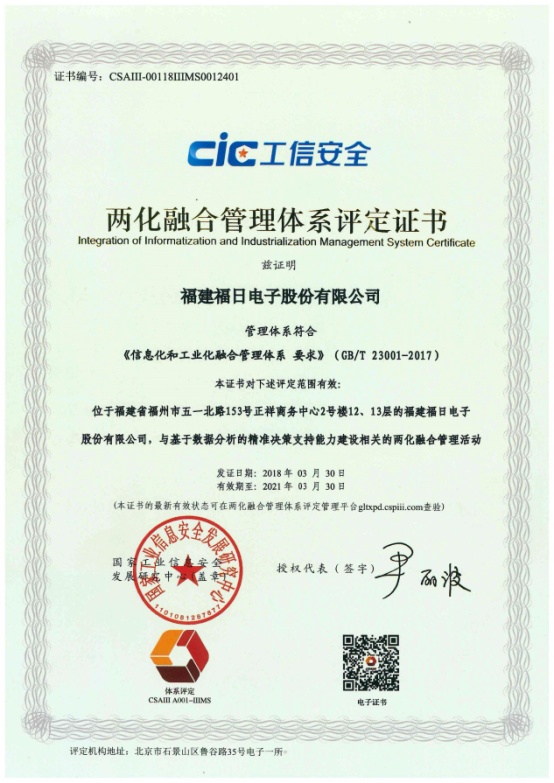 2018年3月30日,福建福日電子股份有限公司獲得了工信部兩化融合管理體系評定證書。公司2017年6月啟動兩化融合管理體系貫標,打造信息化環(huán)境下的新型能力——基于數據分析的精準決策支持能力,并于2017年8月列入工信部“2017年兩化融合管理體系貫標試點企業(yè)名單”。通過本質貫標,公司在福建省電子信息集團系統(tǒng)先行先試,率先通過兩化融合管理體系貫標評定。公司將不斷完善兩化融合管理體系,促進兩化融合建設成果深化應用,提升公司核心競爭力。