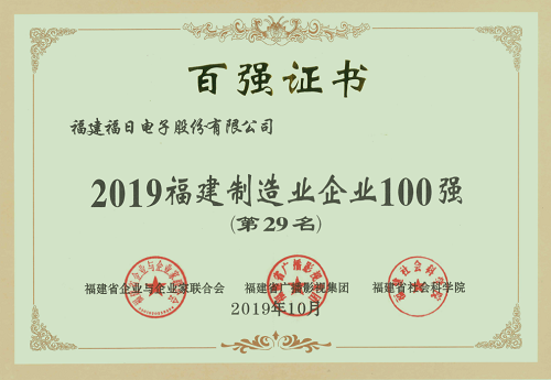 2019年10月24日,由福建省企業(yè)與企業(yè)家聯(lián)合會、福建省社會科學院、福建省廣播影視集團共同舉辦的2019年福建企業(yè)100強研究發(fā)布會在福建漳州舉行,福建福日電子股份有限公司入選2019福建制造業(yè)企業(yè)100強。福日電子總裁溫春旺受邀參會。