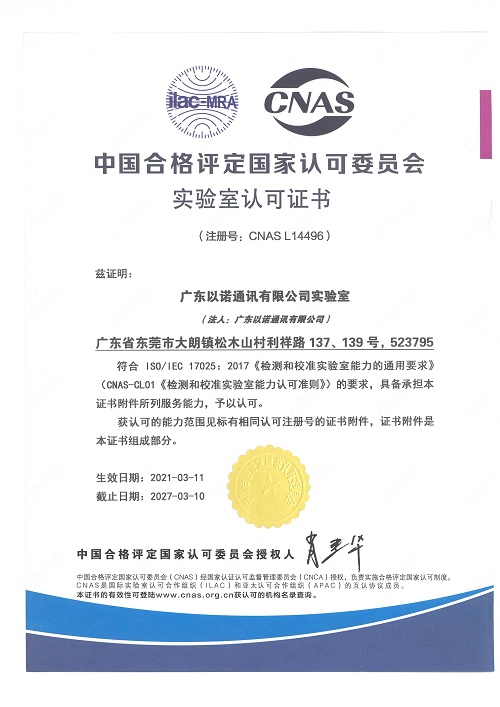 以諾通訊實(shí)驗(yàn)室通過CNAS國家認(rèn)可實(shí)驗(yàn)室認(rèn)證